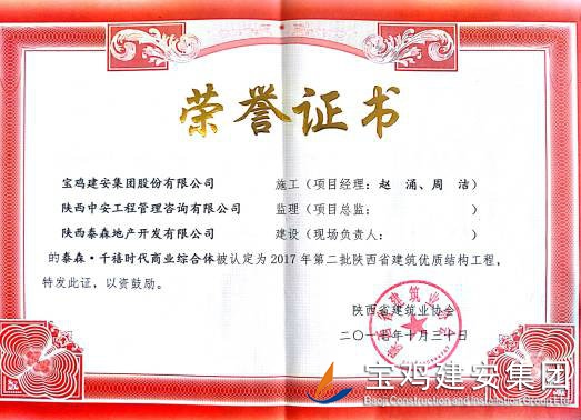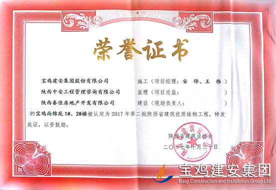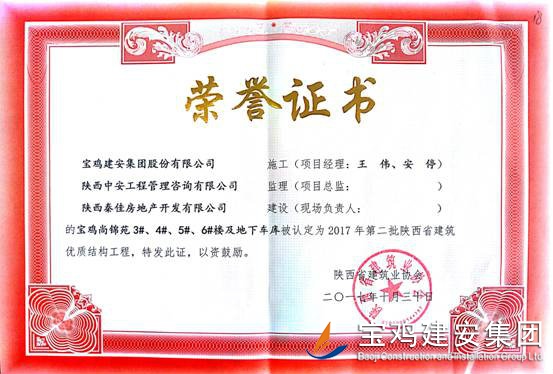 2018年1月26日從陜西省建筑業(yè)協(xié)會(huì)傳來喜訊,由寶雞建安集團(tuán)股份有限公司負(fù)責(zé)施工的“科技研發(fā)樓工程”(五項(xiàng)目部)、“泰森?千禧時(shí)代商業(yè)綜合體”(六項(xiàng)目部)、“寶雞尚錦苑1#、2#樓”、“寶雞尚錦苑3#、4#、5#、6#樓及地下車庫(kù)”及“太白縣城市綜合體項(xiàng)目—酒店及球館工程”(路橋項(xiàng)目部)被陜西省建筑業(yè)協(xié)會(huì)評(píng)為2017年第二批陜西省優(yōu)質(zhì)結(jié)構(gòu)工程獎(jiǎng)。 通過本次獲獎(jiǎng),各項(xiàng)目部能夠依據(jù)項(xiàng)目創(chuàng)優(yōu)要求和相關(guān)法律法規(guī)開展質(zhì)量創(chuàng)優(yōu)工作,對(duì)現(xiàn)場(chǎng)原材料、檢驗(yàn)批、分部、分項(xiàng)工程及功能性設(shè)施進(jìn)行質(zhì)量管理,做好“三檢”工作,切實(shí)履行了質(zhì)量管理職責(zé)。在施工過程中,公司加強(qiáng)對(duì)項(xiàng)目實(shí)體質(zhì)量和資料的檢查監(jiān)督,推行質(zhì)量標(biāo)準(zhǔn)化,確保了每一項(xiàng)工程都能順利驗(yàn)收通過。 希望各項(xiàng)目部在2018年應(yīng)夠繼續(xù)加強(qiáng)現(xiàn)場(chǎng)質(zhì)量意識(shí),提升項(xiàng)目質(zhì)量管理水平。質(zhì)量部也將繼續(xù)總結(jié)獲獎(jiǎng)工程的典型引路和示范作用經(jīng)驗(yàn),強(qiáng)化工程建設(shè)質(zhì)量管理,多出精品,推動(dòng)公司總體水平穩(wěn)步提高。