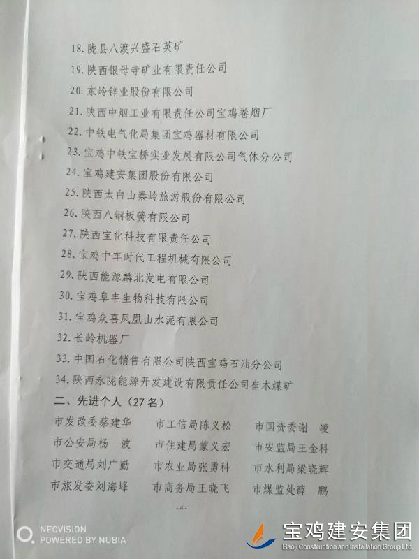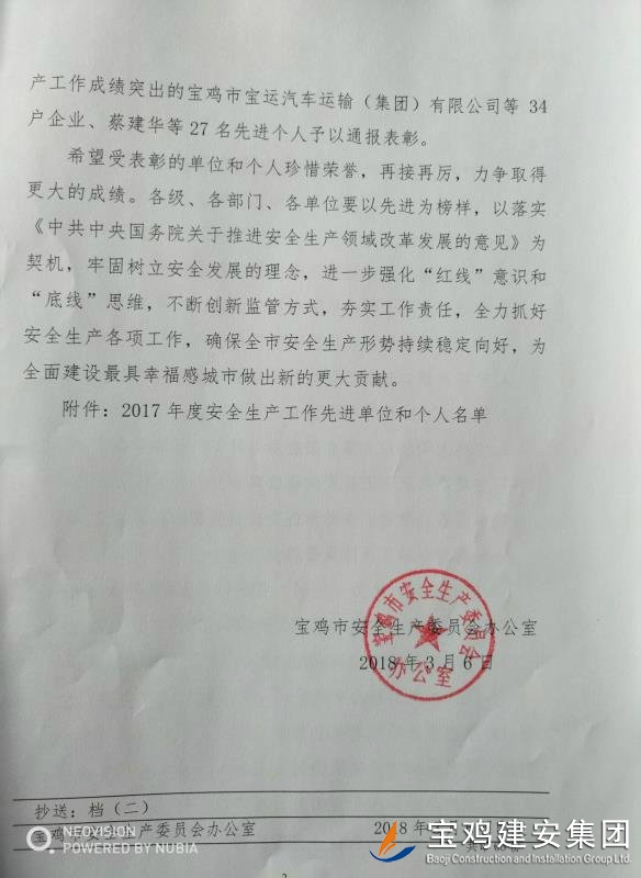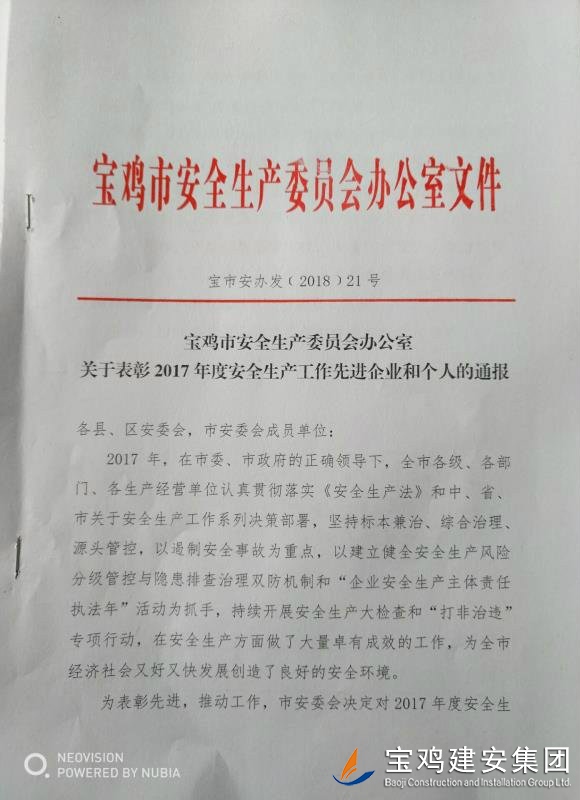 近期,寶雞市安委會(huì)對(duì)2017年度安全生產(chǎn)先進(jìn)單位進(jìn)行了通報(bào),我單位在考核中以優(yōu)異的成績(jī)獲得了此項(xiàng)殊榮。當(dāng)然,取得這樣的成績(jī),離不開各級(jí)領(lǐng)導(dǎo)的正確決策和基層單位的艱辛付出,公司安委會(huì)在此表示感謝。 2017年,公司始終圍繞在國家的大政方針框架下,積極展開以《安全生產(chǎn)法》及相關(guān)規(guī)范標(biāo)準(zhǔn)為核心的安全工作,堅(jiān)持標(biāo)本兼治、綜合治理、源頭管控,以遏制安全事故為重點(diǎn),建立健全安全生產(chǎn)風(fēng)險(xiǎn)分級(jí)管控與隱患排查治理雙重機(jī)制,持續(xù)開展安全生產(chǎn)專項(xiàng)檢查,杜絕了惡性事故的發(fā)生。在安全生產(chǎn)標(biāo)準(zhǔn)化建設(shè)中,公司始終以“科技創(chuàng)新、合理投入、擇善而從”為出發(fā)點(diǎn)進(jìn)行部署管理,通過系統(tǒng)管理及一系列舉措,使公司安全管理走在本土行業(yè)前列,且在多次檢查驗(yàn)收中,獲得省、市級(jí)領(lǐng)導(dǎo)的點(diǎn)贊。 九牛一毫莫自夸 驕傲自滿必翻車,成績(jī)只代表過去,2018年,我們要完善不足,戒驕戒躁,砥礪前行。 寶雞建安集團(tuán)股份有限公司安委會(huì) 2018年4月25日