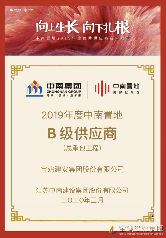 “中南置地2019年度優(yōu)秀供應(yīng)商”由中南置地設(shè)立,從全國100座城市360個(gè)標(biāo)桿項(xiàng)目中選出,A級供應(yīng)商8家,B級供應(yīng)商36家。寶雞建安集團(tuán)股份有限公司在360個(gè)標(biāo)桿項(xiàng)目中脫穎而出,成為陜西省唯一一家B級供應(yīng)商。