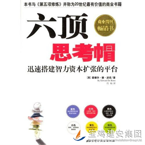 《六頂思考帽》是著名的英國(guó)創(chuàng)新思維家愛德華.德.博諾的作品,它通過(guò)六種不同顏色詮釋了六種不同的觀點(diǎn)。六頂分別是每個(gè)人都認(rèn)識(shí):藍(lán)、白、紅、黃、黑、綠這六種不同的顏色,之所以叫思考帽,是形象地讓人更容易理解和接受,也能夠想象到自己戴上或摘下不同顏色帽子的感受。 藍(lán)帽:觀察和管理思考。藍(lán)帽負(fù)責(zé)控制各種思考帽的使用順序,它規(guī)劃和管理整個(gè)思考過(guò)程,并負(fù)責(zé)做出結(jié)論。