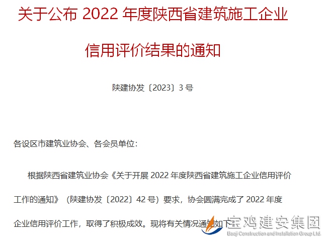 按照統(tǒng)一安排部署,省建協(xié)于2022年11月19日組織評(píng)審專家一行蒞臨建安集團(tuán),現(xiàn)場(chǎng)面對(duì)面審驗(yàn)資料,并深入明星村棚戶區(qū)改造三期地塊一項(xiàng)目1#-2#商住樓及地下車庫(kù)項(xiàng)目進(jìn)行實(shí)地訪談,隨后協(xié)會(huì)又于2023年1月11日正式發(fā)文進(jìn)行為期7天的公示,最終,我公司順利通過(guò)復(fù)審,再次躋身陜西省建筑施工企業(yè)信用評(píng)級(jí)AAA級(jí)企業(yè)行列。