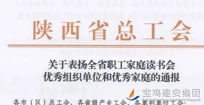 另據消息,在第28個“世界讀書日”到來之際,由市總工會推薦的全市職工讀書活動兩個代表家庭,被陜西省總工會授予全省優(yōu)秀單位稱號,寶雞建安集團工會成為代表全市職工讀書活動中的典型表率之一,受到全省通報嘉獎,為寶雞贏得了榮譽。